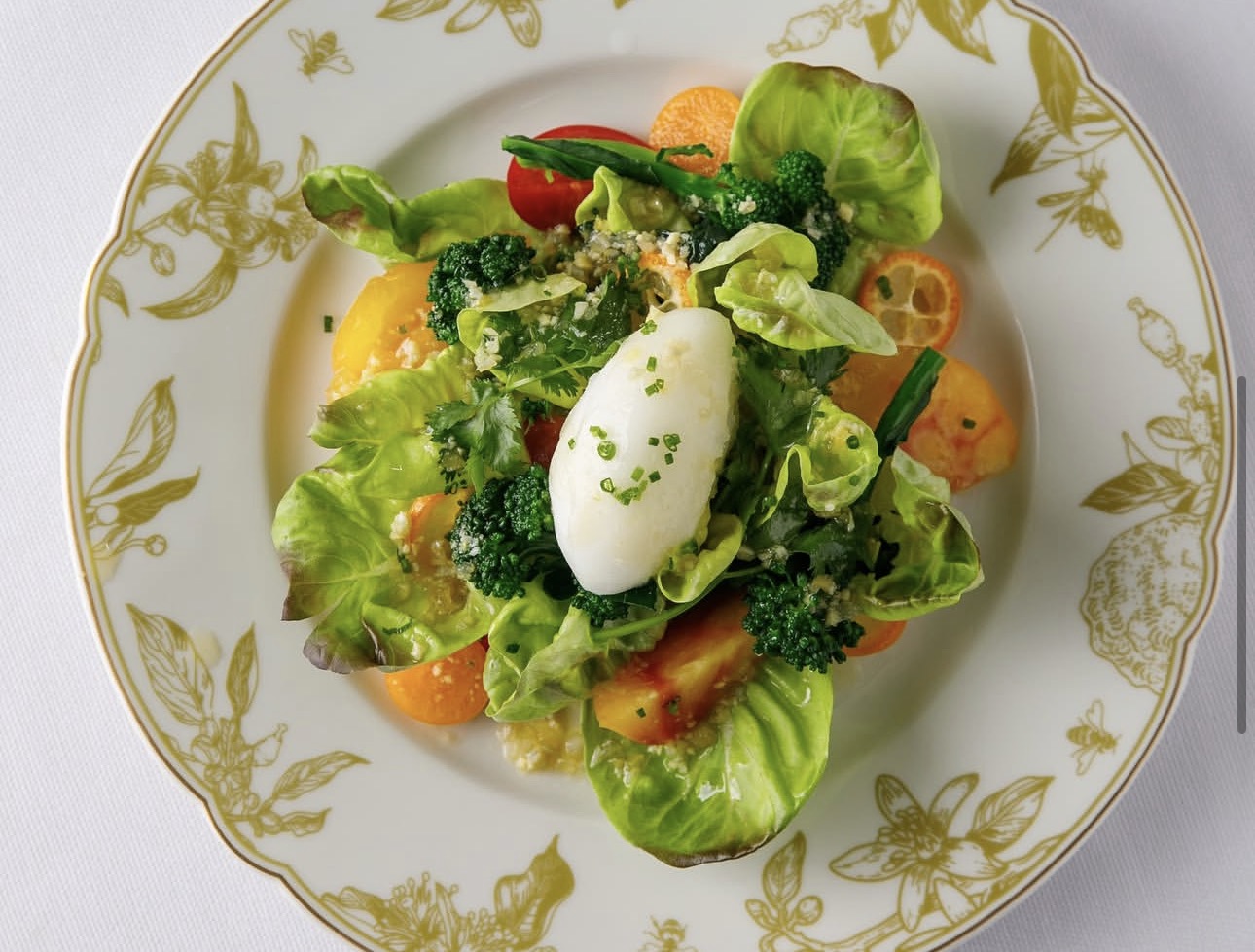 Кухня сочетает средиземноморские традиции с изящной азиатской техникой. В меню — сезонные премиум-продукты и редкости: мясные голуби, курица породы маран и атлантическая тюрбо.
