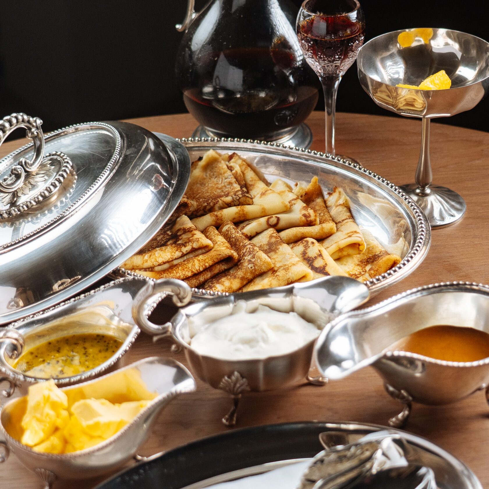 Главный курс, конечно, Blini & Caviar: кружевные русские блины подают с осетровой икрой, а также с икрой ряпушки и лососевой.