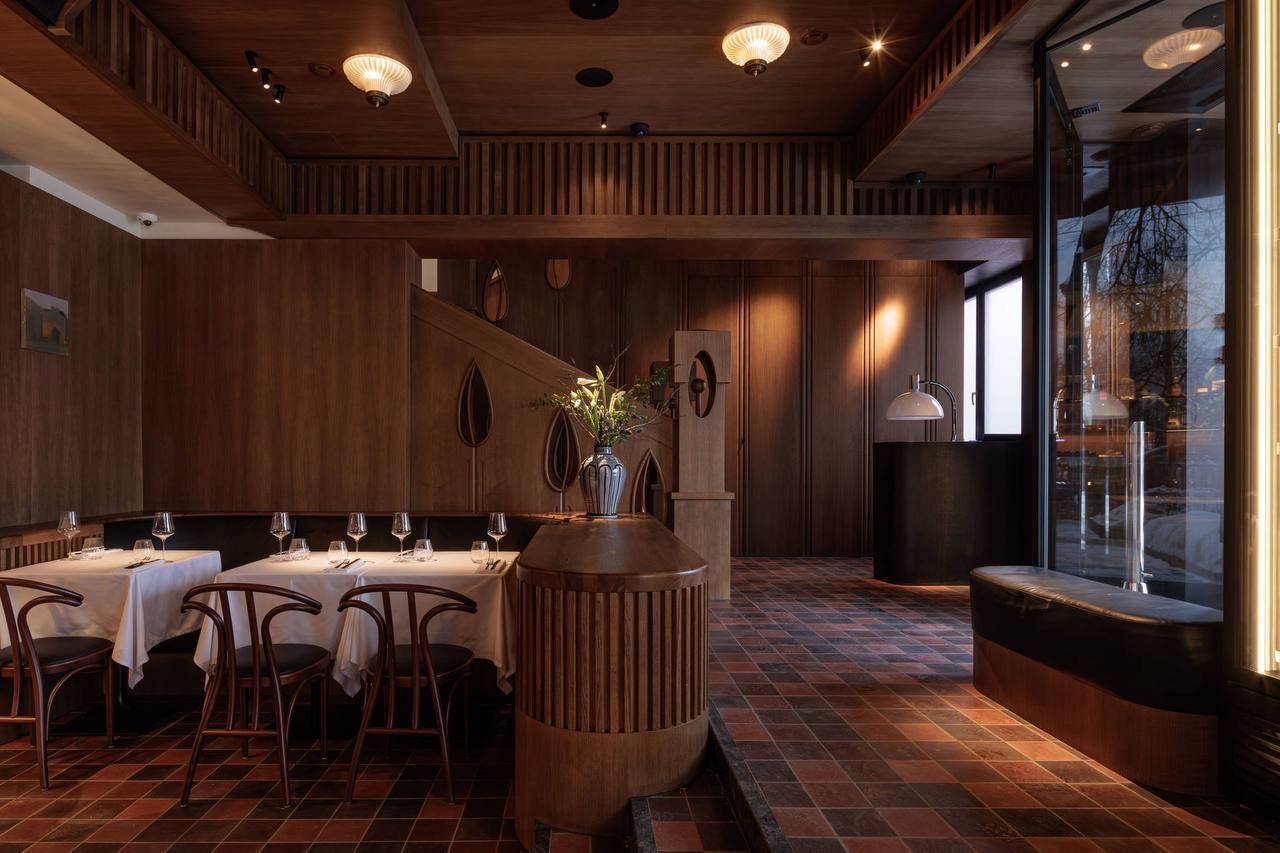 В интерьере панорамные окна, тёмное дерево и белые скатерти;