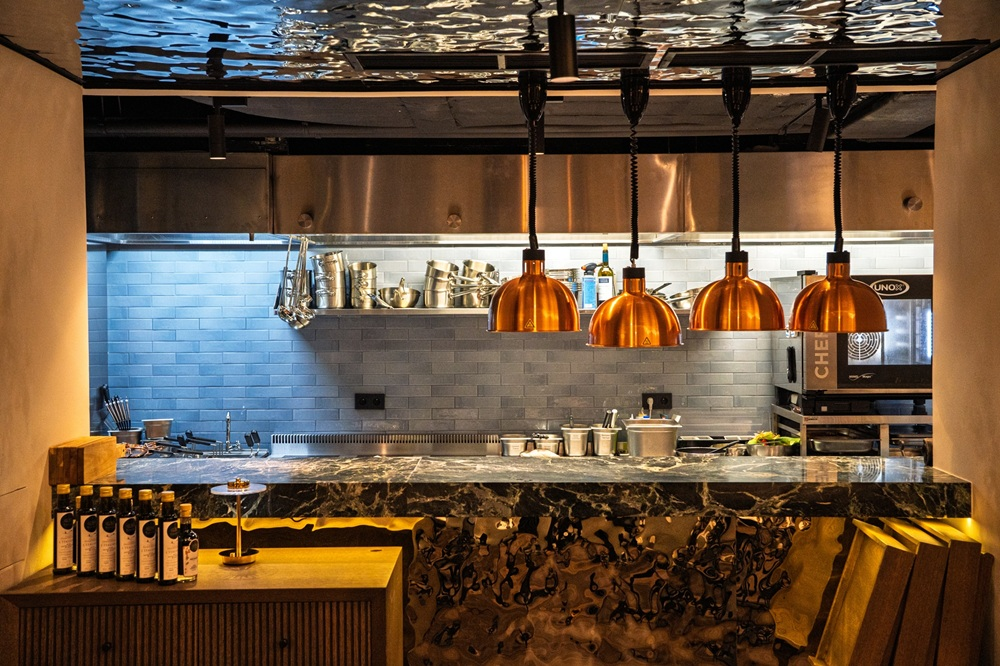 Интерьер построен на натуральных материалах — мраморе и дереве — и отражает представление шефа о классической, основательной Италии без декоративных излишеств. Барную программу курирует Евгений Поликарпов: в коктейлях используются травы и ароматические мотивы Средиземноморья, в том числе Магриба и Греции.