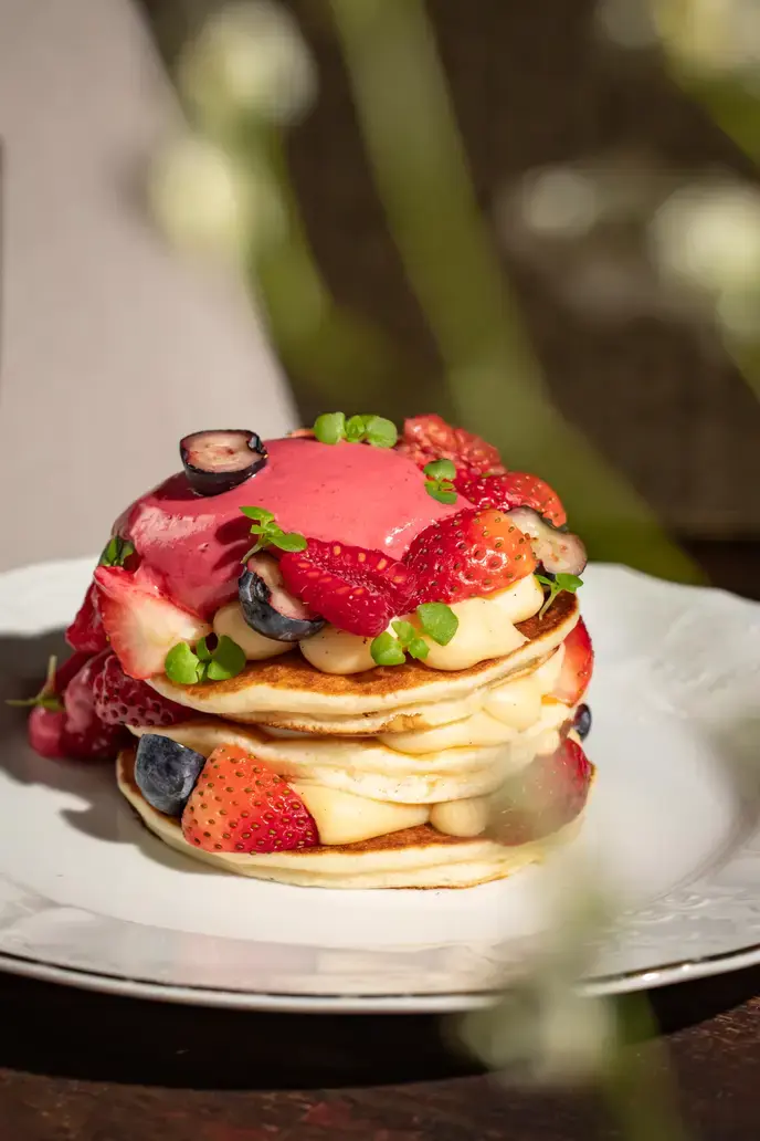 - Панкейки с малиновым сорбетом и ягодами;