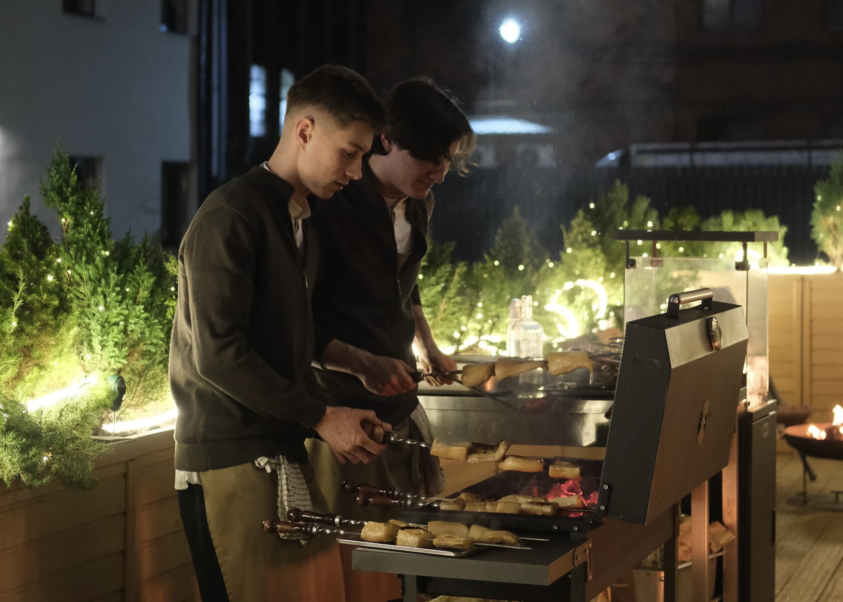 Праздничный бранч во дворике ресторана с открытым огнём и пикниковым меню: запечённый на углях картофель с щучьей икрой, копчёное ребро бычка с соусом BBQ, стейк рибай на углях и другие блюда.