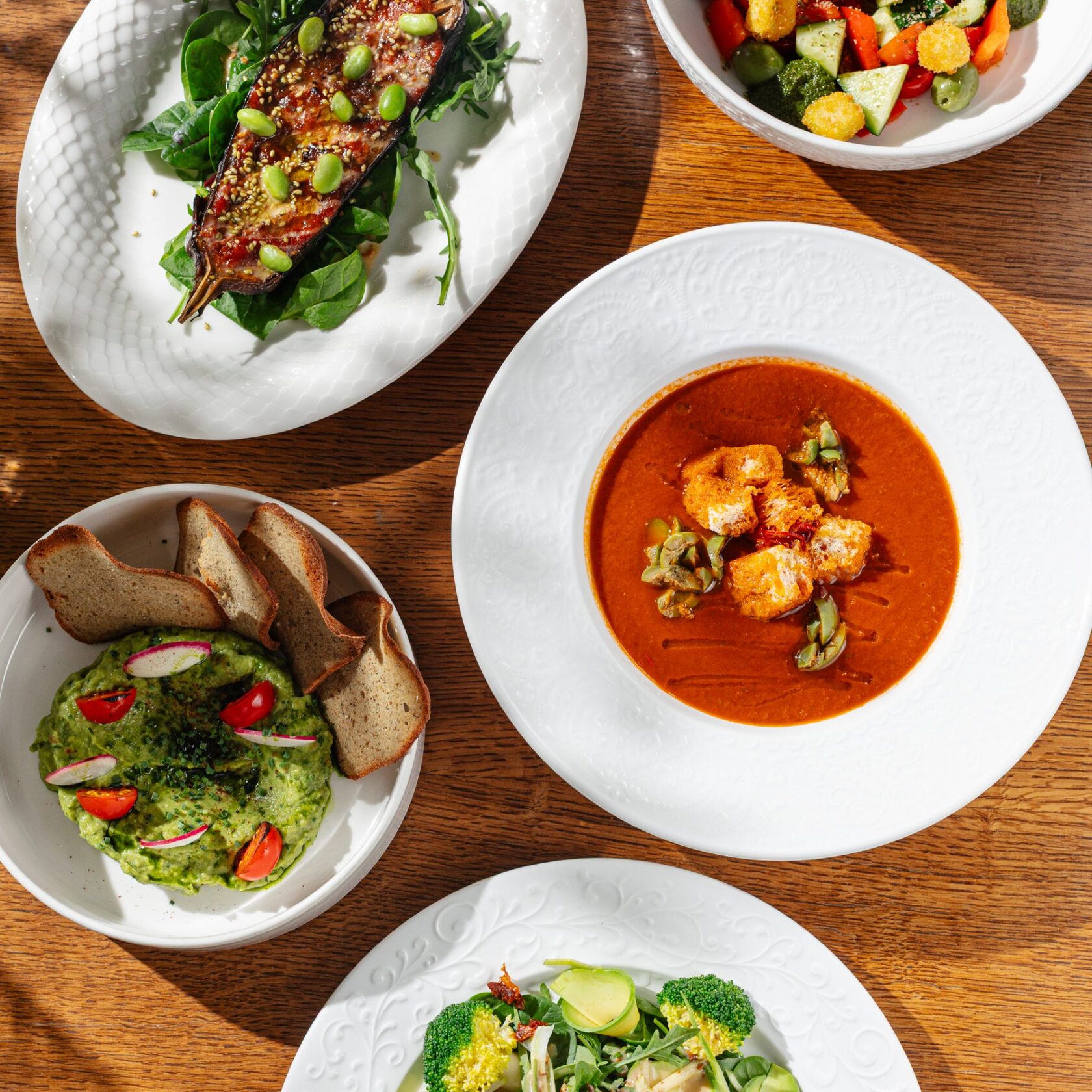 Среди горячих позиций — запечённый баклажан с мисо-карамелью. В салатной части — греческий салат с тофу и фирменный салат Avocado Queen — блюдо, наполненное зелёным цветом. В его основе — капуста бок-чой, шпинат и авокадо и яблоко, дополненные свежими овощами и кунжутной заправкой. Дополняет меню гуакомоле с безглютеновыми чипсами.