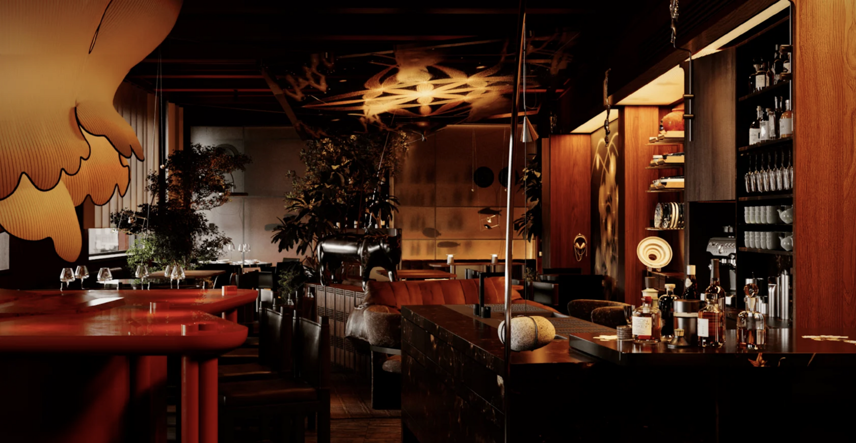 Интерьер погружает в атмосферу Поднебесной с парящими полотнами, винтажными вазами и крупными растениями. Гостям предлагают DYI-гриль — возможность самостоятельно приготовить вагю или деликатный о-торо прямо за столом.